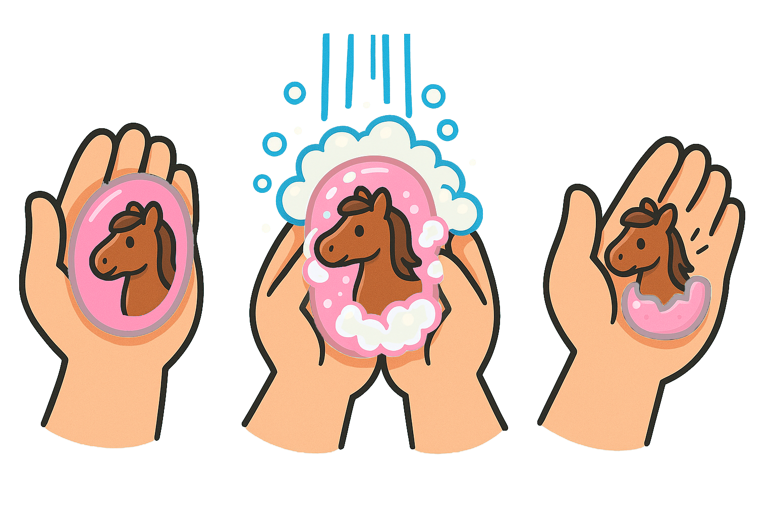 Die Pony-Seife zeigt verspielte Blümchen und enthält ein süßes, schimmerndes Überraschungsspielzeug – eins von vielen Ponys. Perfekt für kleine Mädchen & Jungs die auf süße Tiere stehen.